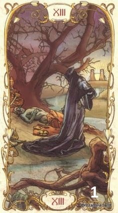 Döden visar på en större förändring, dags att släppa gamla mönster, förnyelse, omvandling och avslutning. För att komma vidare måste ibland något avslutas. När dödens kort kommer så är det stora förändringar på gång. Något tar slut och något annat tar vid. Döden visar ofta på större förändringar i livet som kan vara jobbiga. Man får ta farväl och lämna något som betytt mycket för en, men där något avslutas finns också en början på något nytt. Ofta dyker döden upp när en relation tar slut eller då man är tvungen att sluta på sin arbetsplats. Kan också betyda att man släpper gamla vanor och beteendemönster, man går vidare och börjar om. På en arbetsplats kan förändringar träda i kraft. Det kan vara förändrade arbetsuppgifter eller att uppgifterna kräver ett nytt sätt att utövas. Ibland kan det handla om en uppsägning, att man blir av med sitt arbete. I kärleksrelationer visar kortet döden på ett avslut men kan också vara att man vill lägga något åt sidan i relationen och ta in något som kan föra en framåt i utvecklingen. Gällande ekonomin står kortet för en förändring. En inkomstkälla kan sluta ge dig pengar eller en svår ekonomisk situation kommer till ända och slutar att gälla. Här kommer du säkert ändra uppfattning gällande det ekonomiska och se på saken annorlunda. Döden talar om att det är förändringar på gång, även inre förändringar, t ex nya sätt att tänka och ett behov av att bryta negativa vanor. Att man vet om att en förändring behövs men att man är man rädd för att genomföra dem. Tankar om förändring finns men handlingen kommer senare. Döden visar också på att du sitter fast i gamla tankemönster som det är dags att bryta och förändra. Du upplever säkert att mönster och beteenden som tidigare fungerat som ett skydd inte längre finns, och att dessa snarare har en begränsande och hindrande inverkan på ditt liv idag.