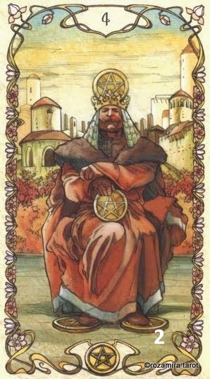 Fyra mynt/pentagram står för materiell och ekonomisk stabilitet. Ha nu ordning och reda på det materiella och gå igenom det du har. Du har uppnått en materiell trygghet men omge dig inte med prylar du inte behöver. Om du sätter hela din tillvaro och din glädje på det materiella kommer det att bli en börda och kännas betungande för dig. Här kan du behöva utmana dina egna principer och regler. Fyra i mynt talar om att du själv måste se vad du är beredd att riskera för att få lycka, frihet eller tillfredsställelse på längre sikt. Kan också vara en utmaning att göra avkall på. Regler och principer till förmån för livet och för det som känns rätt i hjärtat. Kanske känner du dig begränsad, kontrollerande och alltför styrd av dina egna värderingar. Kortet kan visa på snålhet. Kanske känns den materiella tryggheten och säkerheten hotad så se över din situation. Ser ut som att du har jobbat en längre period för något, skaffat dig en bra grund och vill ha kvar det som du anser är ditt.